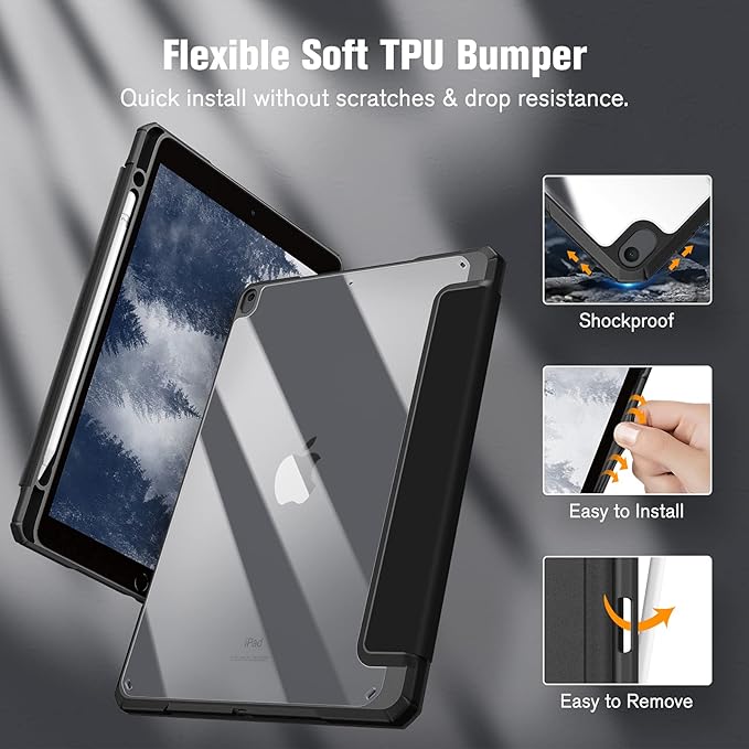 【材料・透明バックカバー】 ケースの表面はPUレザー素材を利用して、軽量、超薄を備えます。ポリカーボネート素材を採用している透明バックカバーは汚れや傷つけなどを防止するだけでなく、iPad本体の色と美しさも活かせます。透明バックカバーの枠は柔