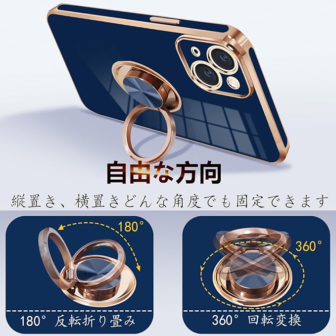 iPhone14 ケース リング付き アイフォン14 リング カバー 耐衝撃 TPU 360 回転 スタンド機能 メッキ加工 車載ホルダー ストラップホール付き 6.1インチ(ブルー)