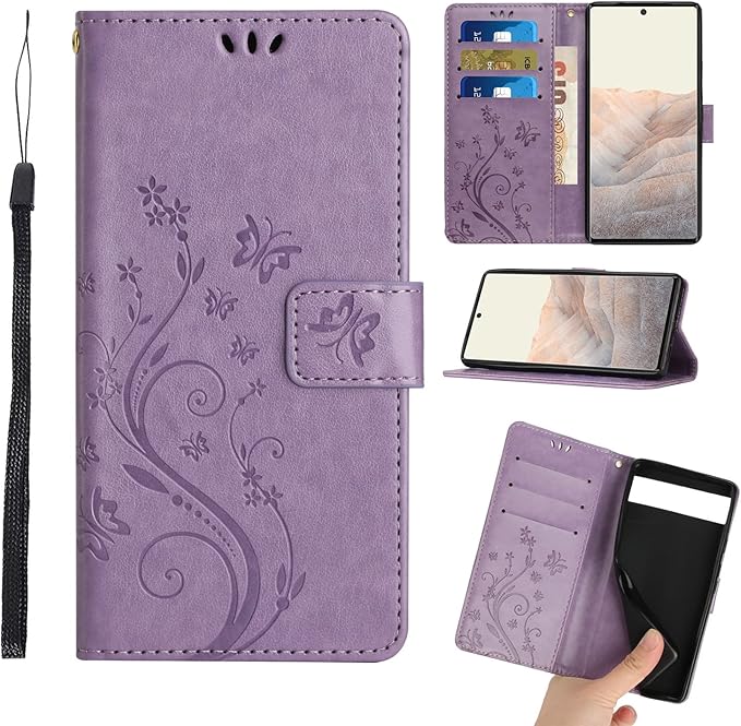 Lhyxuuk Pixel 7a ケース 手帳型 ピクセル7aケースおしゃれ 純色 可愛い花柄 横開きGoogle Pixel 7a PUレザーケース ストラップ付き カードポケット付き オシャレ蝶柄 スタンド耐衝撃 Pixel 7a マートフォンカバー マグネット対応 装着やすい (Google Pixel 7a, ライトパープル)