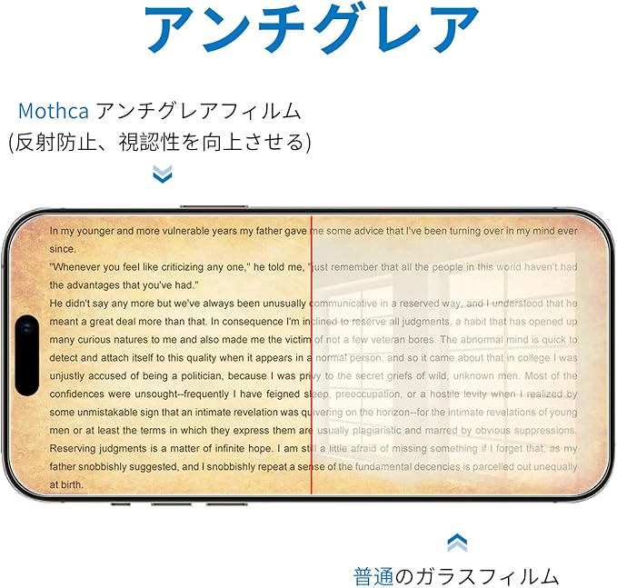 Mothca アンチグレア iPhone 15 Pro Max対応 ガラスフィルム 保護フィルム 強化ガラス サラサラ タッチ感 ゲームフィルム ガイド枠付き 液晶 日本旭硝子製素材 指紋防止 反射防止 硬度9H 飛散防止 キズ防止 衝撃吸収 撥油性 疎水 アンチグレアフィルム