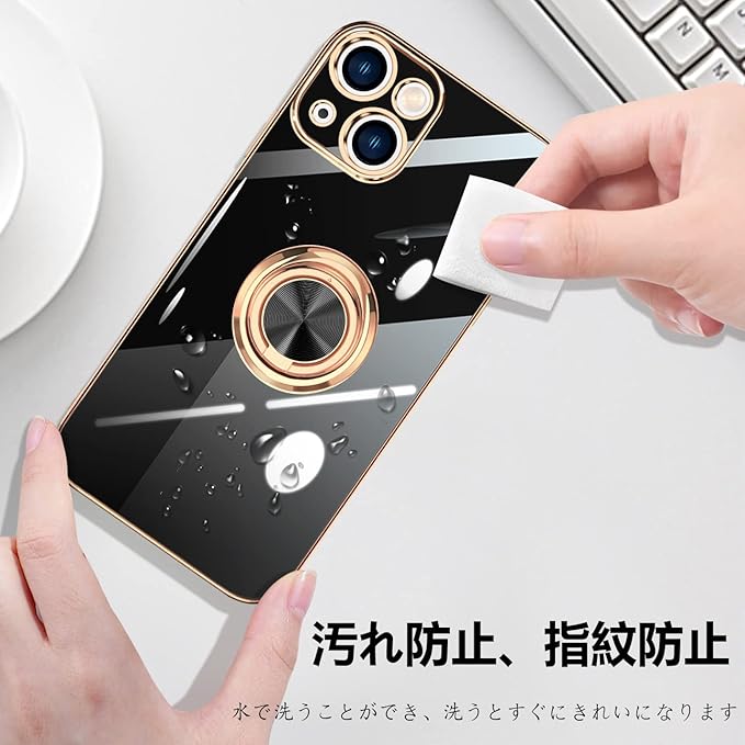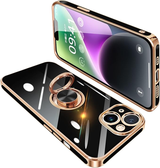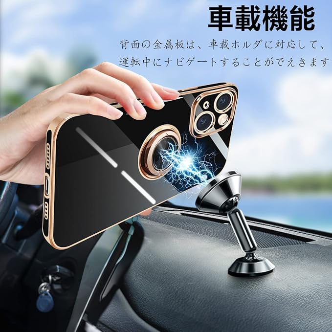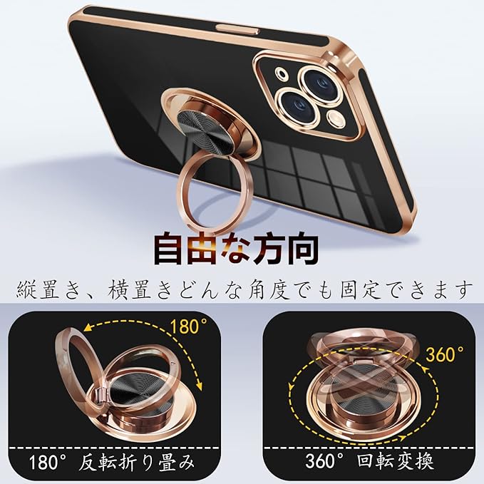 iPhone14 ケース リング付き アイフォン14 リング カバー 耐衝撃 TPU 360°回転 スタンド機能 メッキ加工 車載ホルダー ストラップホール付き 6.1インチ(ブラック)
