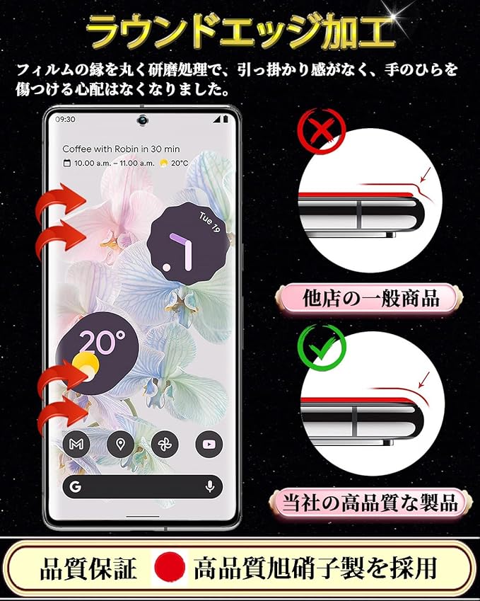 Google Pixel 6 Pro ガラスフィルム グーグル ピクセル 6 Pro 全面保護フィルム【1枚セット】日本製素材旭硝子製 硬度9H 気泡防止 飛散防止 指紋防止 撥水撥油 貼り付け簡単 自動吸着 Google Pixel 6 Pro 液晶強化ガラス
