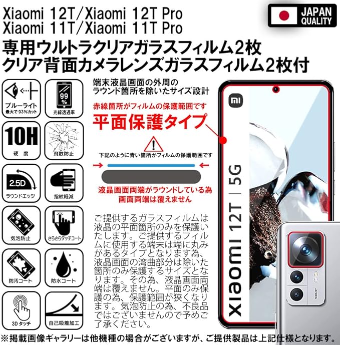RISE 2枚+2枚 フィルム Xiaomi 12T/Xiaomi 12T Pro ガラスフィルム カメラフィルム レンズフィルム レンズ保護ガラス レンズカバー 保護フィルム 強化 ガラス 高透過 高光沢 日本製 旭硝子 硬度9H 2.5Dラウンドエッジ 自動吸着 気泡ゼロ 飛散防止 指紋防止 撥水撥油 3D タッチ For Xiaomi 12T/Xiaomi 12T Pro