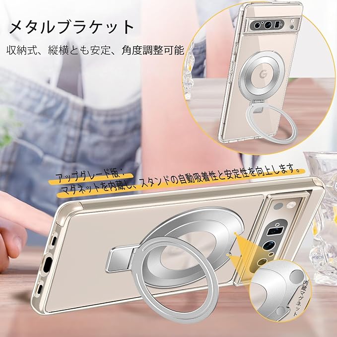 Google Pixel 8 Pro ケース クリア MagSafe対応 スタンド ピクセル8 Pro スマホケース 透明 ワイアレス充電対応 リング 縦横両対応 TPU 背面PC 耐衝撃 黄ばみなし Pixel8 pro カバー ストラップホール付き