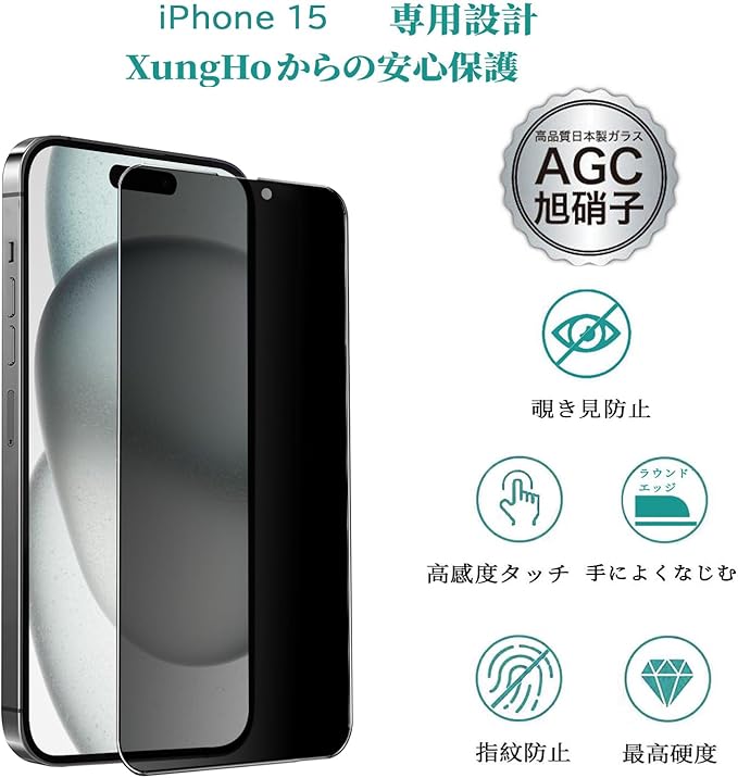 【覗き見防止】 iPhone15 用 ガラスフィルム 覗き見防止 【2枚】+カメラフィルム 【2枚】 【ガイド枠付き】 iPhone15 用 フィルム 液晶保護フィルム のぞき見 強化ガラス アイフォン 15 用 (6.1インチ) のぞき見防止 【全面保護/指紋防止/気泡ゼロ/貼り付け簡単】