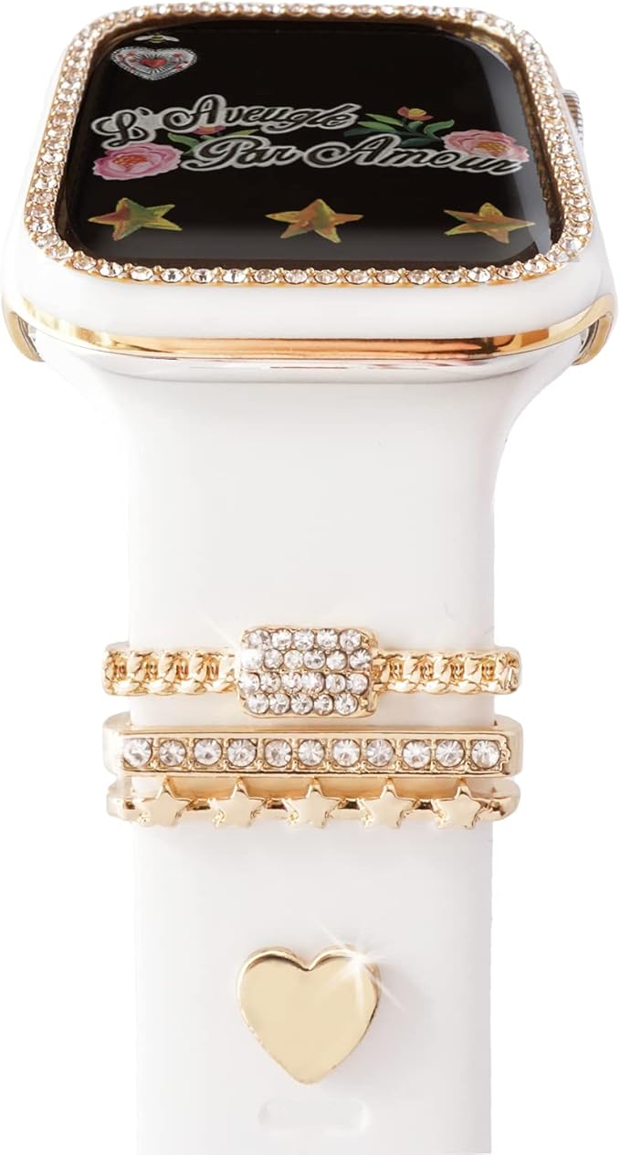 [Lib rez-moi] アップルウォッチ チャーム 4ピースセット ゴールド ハート リベット&スクエア ストーン ケースつき おしゃれ アクセサリー 38mm 40mm 41mm 42mm リング (カレ)