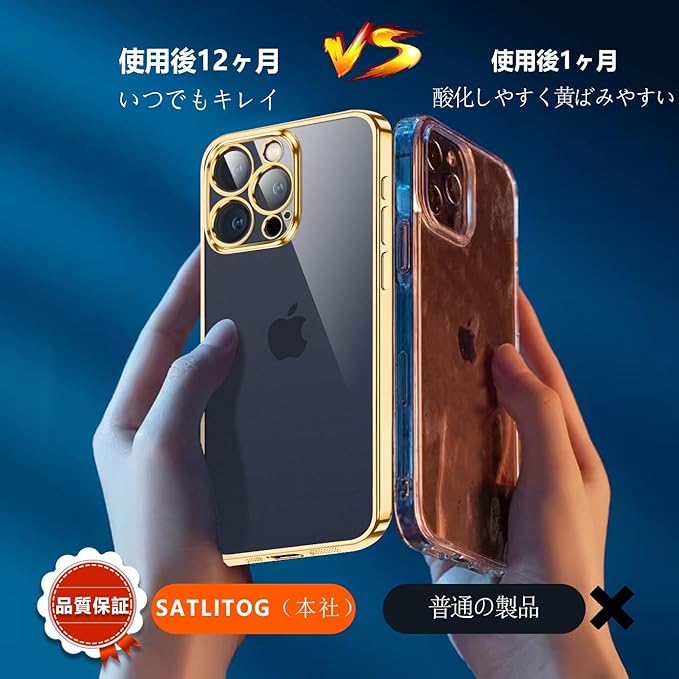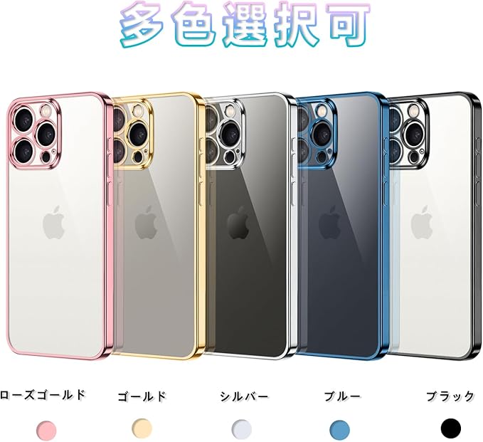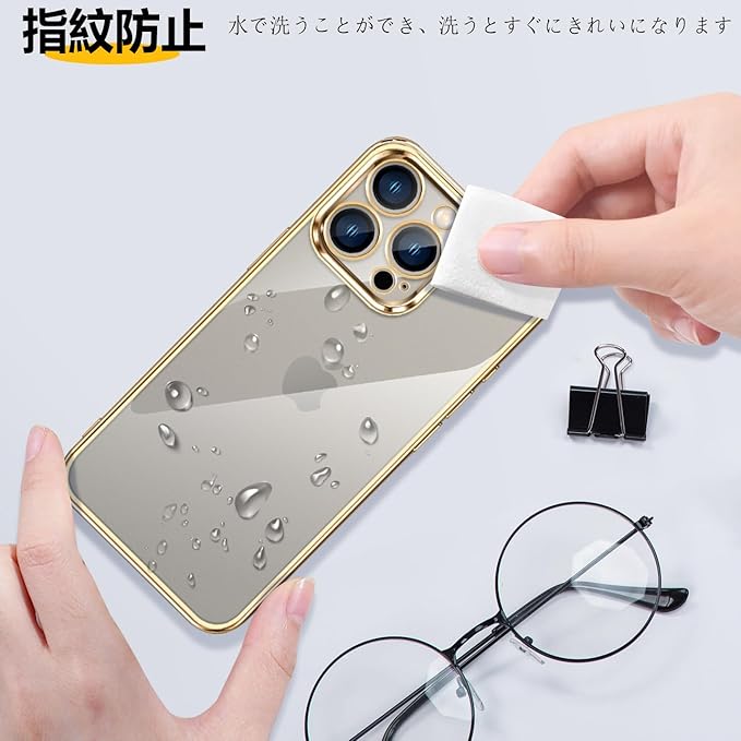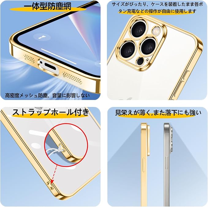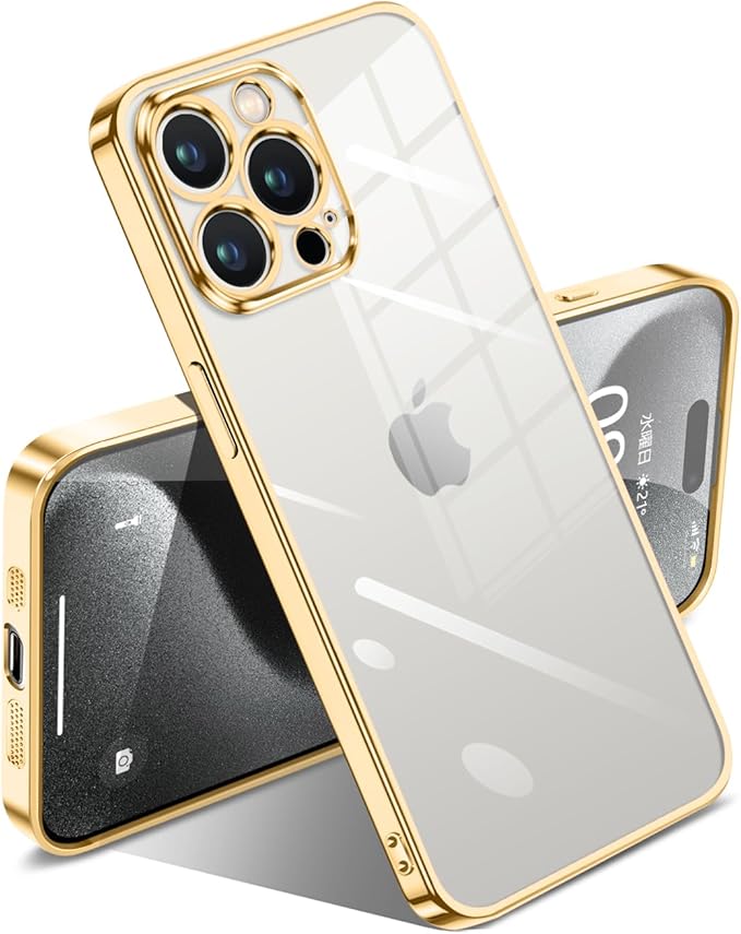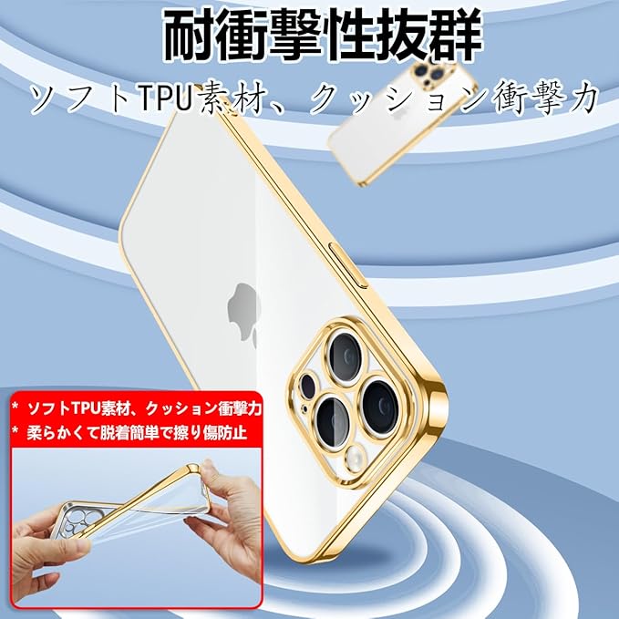 iPhone 15 Pro 用 ケース クリア 耐衝撃 透明 アイフォン15 Pro カバー メッキ加工 完全な保護 黄変防止 落下防止 ファッション 薄型 軽量 TPU 柔らかい ワイヤレス充電 人気 保護カバー(ゴールド)
