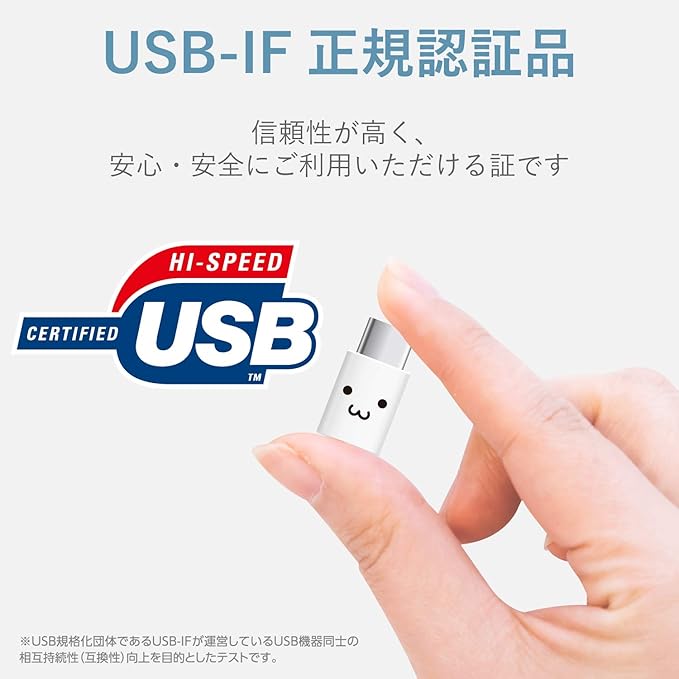 心配ないUSB-IF正規認証品。USB micro-B端子をUSB Type-C端子に変換し、USB Type-C端子搭載のスマートフォンの通信、充電ができるUSB2.0変換アダプタ。