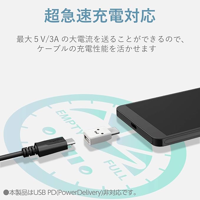 USB micro-B端子をUSB Type-C端子に変換し、USB Type-C端子搭載のスマートフォンの通信、充電ができるUSB2.0変換アダプタです。