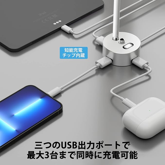 【1台2役のiPencil充電スタンド】3つUSB出力ポート搭載新モデル登場、USBハブとしてご利用可能このApple Pencil充電スタンドにはUSB出力ポートが3ポート搭載され、アップルペンシルを充電しながら、USBハブとして、対応iPad/iPhone/AirPodsなどのデバイスを最大3台まで同時に充電可能。iMangoo 純正品として最新の知能充電チップが内蔵されますが、ご購入する前に是非ご確認ください。