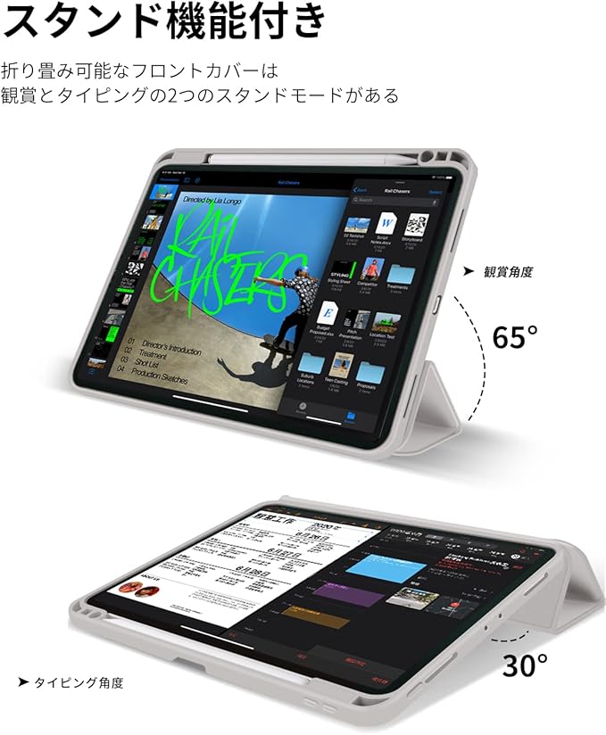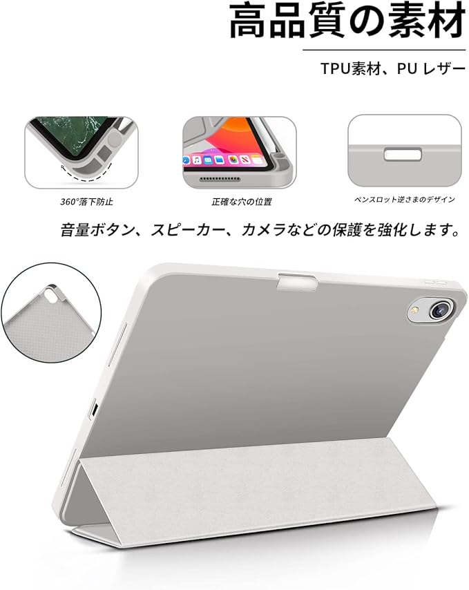 Aoub iPad Air 11 インチ ケース M3/M2 2025/2024 iPad Air 第5/4世代 カバー 2022/2020年 10.9インチ Pencil Proペン収納 Apple Pencil2 ワイヤレス充電対応 オートスリープ/ウェイク機能対応 ソフト TPU 薄型 軽量 耐衝撃 三つ折りスタンド(ホワイトグレー)