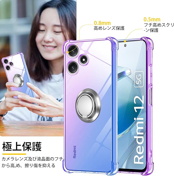 Redmi 12 5G ケース リング TPU 薄型 軽量シリコン グラデーション色 ケース 耐衝撃 指紋防止 車載ホルダー対応 防塵 一体型 人気 携帯カバー(パープルブルー)