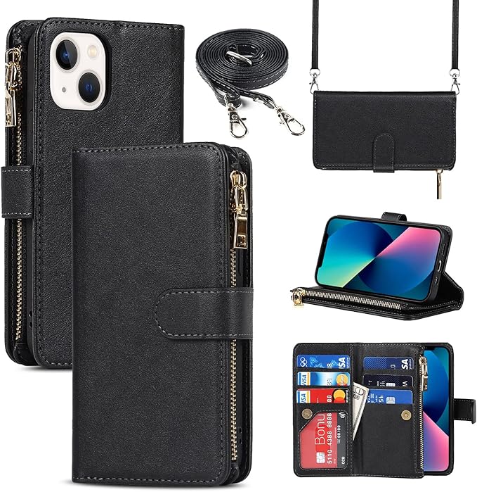 Pelanty for iPhone 13 縄掛けケース 手帳型 携帯カバー 肩掛け首かけ斜めがけ ショルダー 合成皮革+TPUケース マグネット iPhone13 財布型カバー ICカード お札入れ小銭入れ大容量 収納ポケット スタンド機能 アイフォン13 ストラップ付き 落下防止 耐衝撃 耐摩擦 全面保護(肩縄付き-ブラック)
