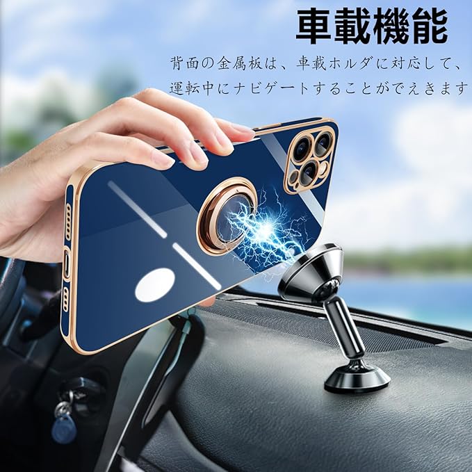 iPhone13 Pro Max ケース リング付き アイフォン13promax リング カバー 耐衝撃 TPU メッキ加工 360°回転 スタンド機能 車載ホルダー ストラップホール付き 6.7インチ(ブルー)