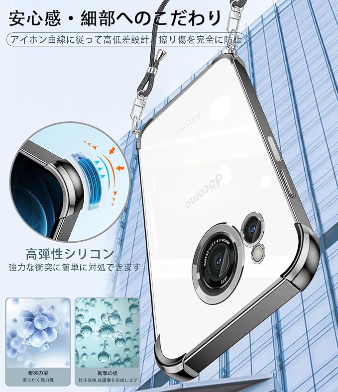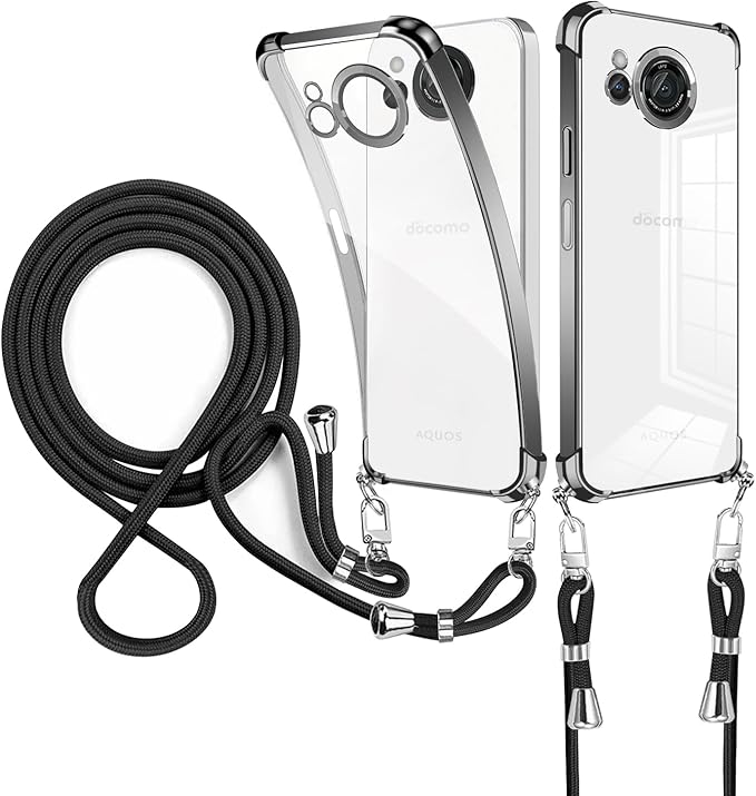 weiaoluo Sharp Aquos R8 ケース ショルダー クリア 薄型 軽量 SH-52D スマホケース Aquos R8 カバー 耐衝撃 薄型 TPU 軽量 肩がけ 首掛け 紐付きバンパー カバー ストラップ付き ストラップホール付き 韓国 透明 ストラップ着脱可 調節 Qi充電 ワイヤレス充電 傷防止 全面(ブラック)