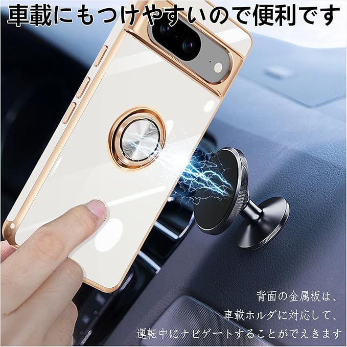 Google Pixel 8 ケース リング付き リング 米軍MIL規格 耐衝撃 ピクセル8 カバー メタリックな質感 磁気吸着 携帯カバー TPU 軽量 人気 スタンド機能 車載ホルダー対応 360 回転 黄変防止 指紋防止(ホワイト)