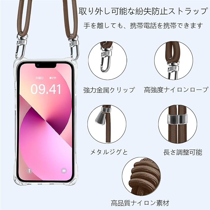 iPhone14 ケース ショルダー クリア 肩掛け 首掛け アイフォン14 スマホケース 斜めかけケース カバー 耐衝撃 軽量薄型 全面保護 人気 韓国 柔軟 高質感(ブラウン)
