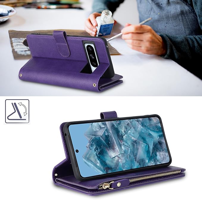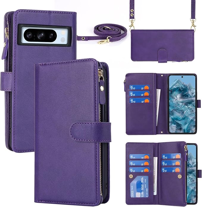 Pelanty for Pixel 8 Pro 縄掛けケース手帳型 携帯カバー 肩掛け斜めがけ ショルダー 合成皮革+TPU マグネット Google pixel8 pro 財布型カバー ICカード お札入れ小銭入れ大容量 収納ポケット スタンド機能 グーグル ピクセル8pro 6.7インチ ストラップ付き 落下防止 耐衝撃 全面保護(肩縄付き-パープル)
