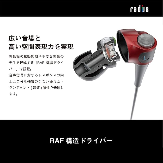 【RAFドライバー】新開発「RAF構造(Rear Air Flow system)ドライバー」採用。ドライバーユニット内後方に背圧を正確にコントロールするチャンバーを設け振動板の高い制動性を実現。振動板の振動抑制や不要振動の発生を軽減することで、音声信号に対するレスポンスの向上と余分な残響の少ない優れたトランジェント(過渡)特性を発揮します。
