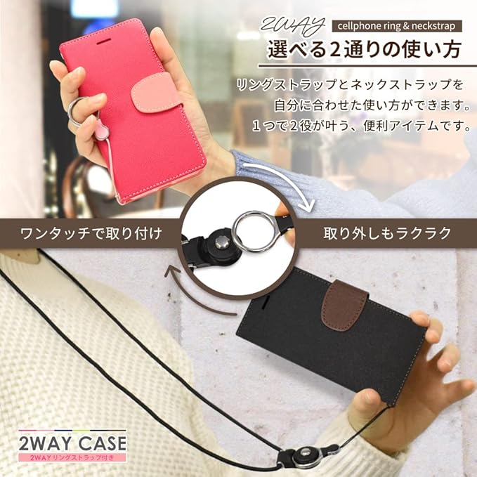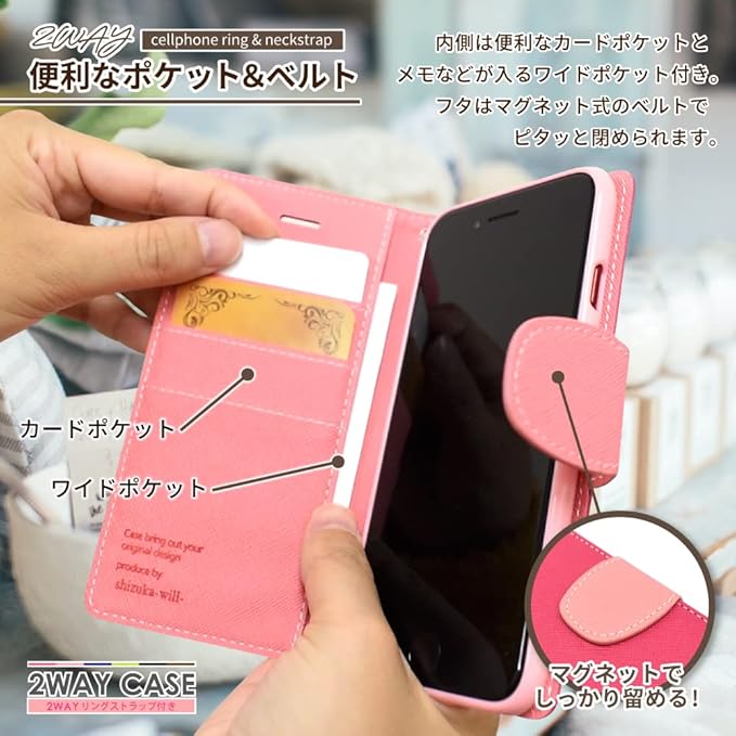 シズカウィル SHARP AQUOS R3 docomo SH-04L au SHV44 Softbank simフリー 手帳型 ケース カバー 2WAYワンタッチ着脱ストラップ付 ピンク ストロベリー
