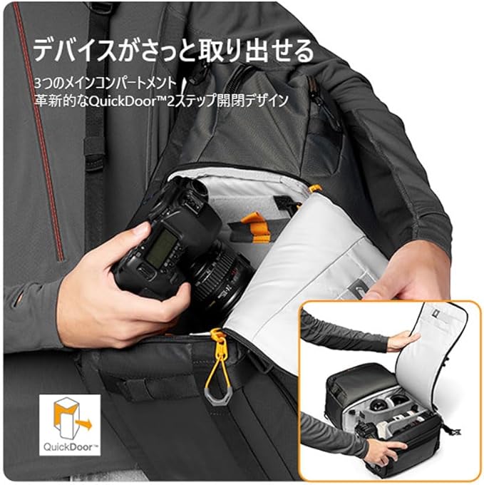 バッグ下部は、バッグを下ろさずにカメラ機材にアクセスすることが可能なQuick Doorシステムを採用。このシステムにより、急なシャッターチャンスにも素早くカメラにアクセスすることが可能です。バッグを下ろして大きく開閉することもできます。また、カメラ収納部は、機材をしっかり保護しながら、収納スペースを有