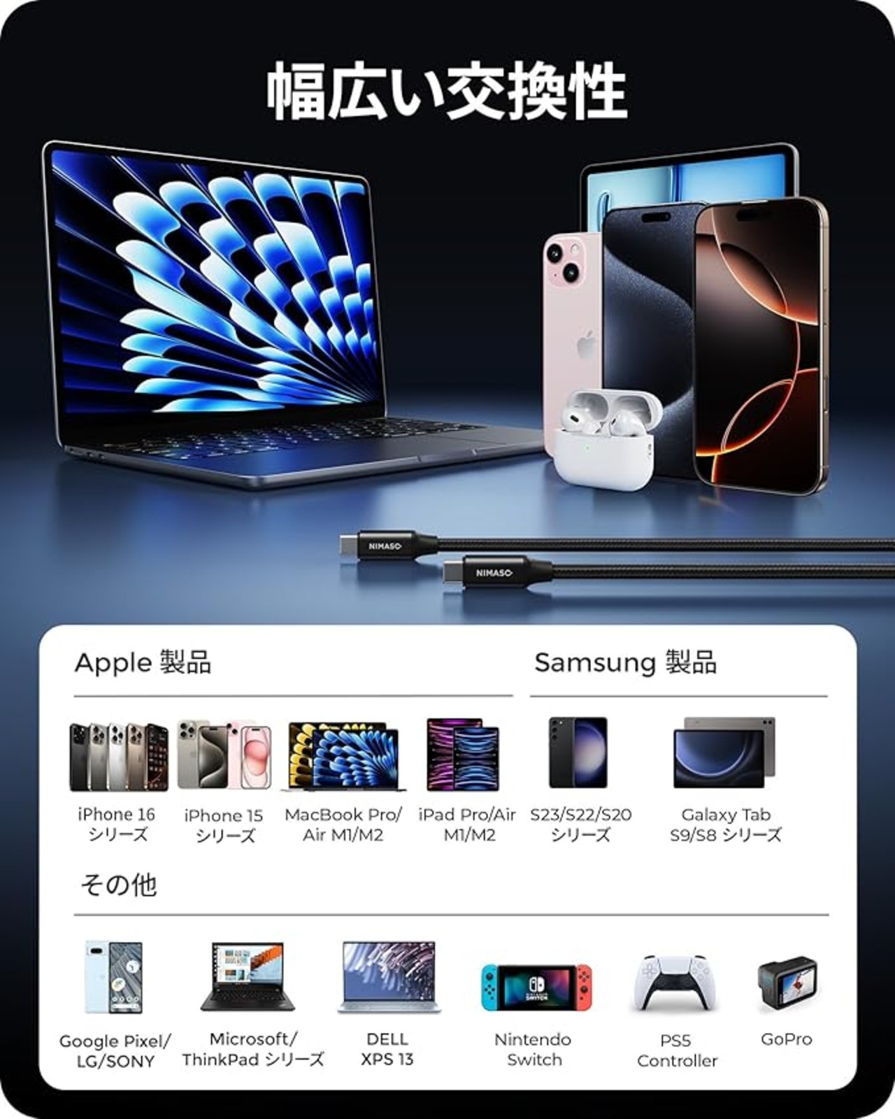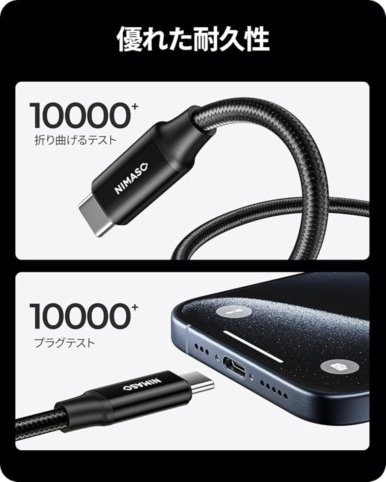 NIMASO USB C Type C ケーブル USB3.2Gen2【100W/5A急速充電 PD対応 4K / 60Hz 映像出力 2m】 タイプc ケーブル iPhone16/ 15 シリーズ MacBook、iPad mini6、iPad Pro等type c機種対応NCA20E73