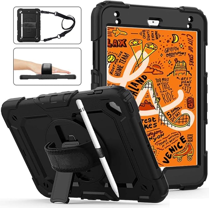 SIBEITU iPad Mini 第5世代/第4世代 ケース 耐衝撃 傷防止 「360 回転スタンド」 「360 回転握り方」 「ペン収納」「保護フィルム付き」 「調節可能」 肩紐 先進の機能追加 三層保護 携帯便利 防塵 多機能 子供 実用 安易の操作 iPad Mini5/Mini4 7.9インチ 2019/2015 専用 ケース(ブラック)