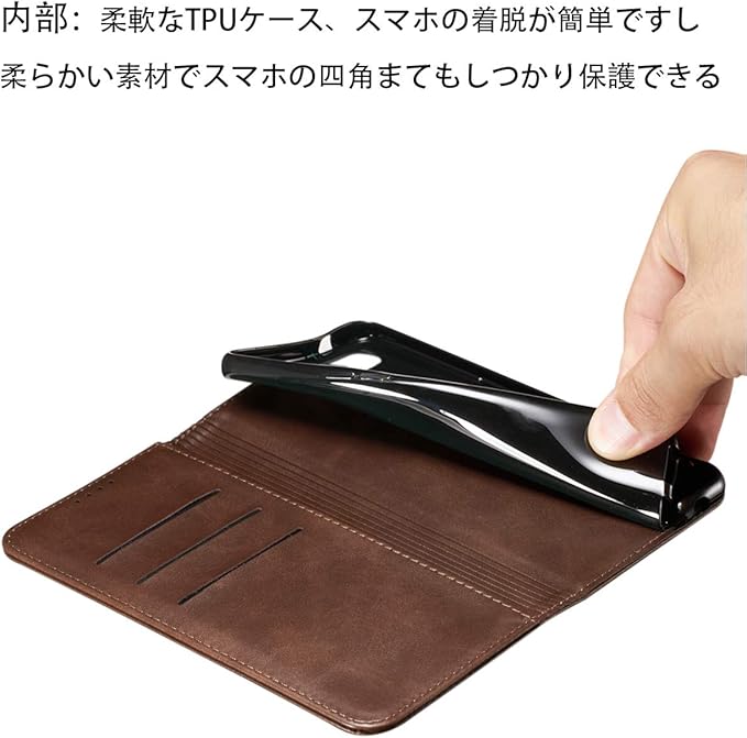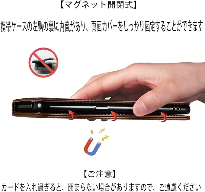 【カードポケット付き】:財布型ケースとして、名刺やお札などを入れるカードポケットがつき、ちょっとしたお出かけにもスマホケース一つでOK日常生活に便利です。ただし、カードを入れ過ぎると、閉まらない場合がありますので、ご遠慮ください。