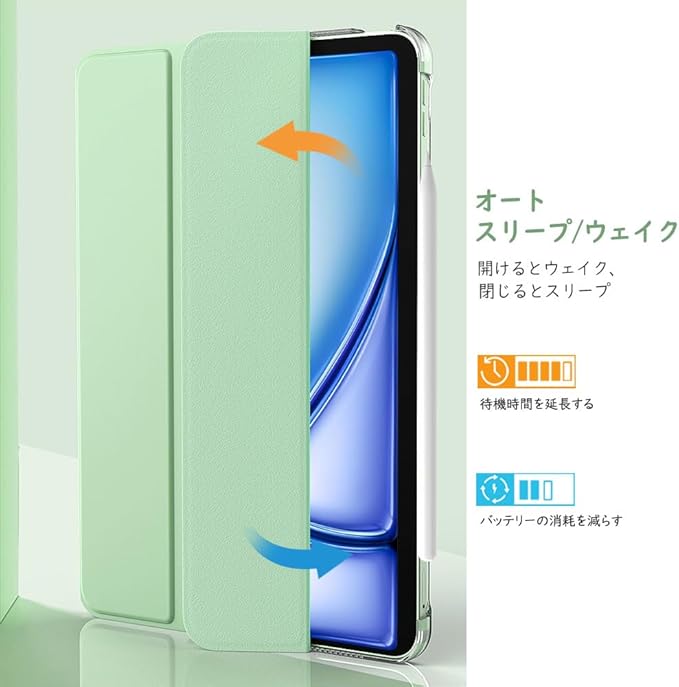 TiMOVO iPad Air 11インチ ケース M3/M2 第7/6世代 (2025/2024) iPad air 第5/4世代 ケース 10.9インチ iPadAir7/6/5/4 カバー 11インチ/10.9インチ PencilPro/第2世代ワイヤレス充電対応 PUレーザー 三つ折り オートスリープ機能 落下防止 手帳型 半透明 グリーン