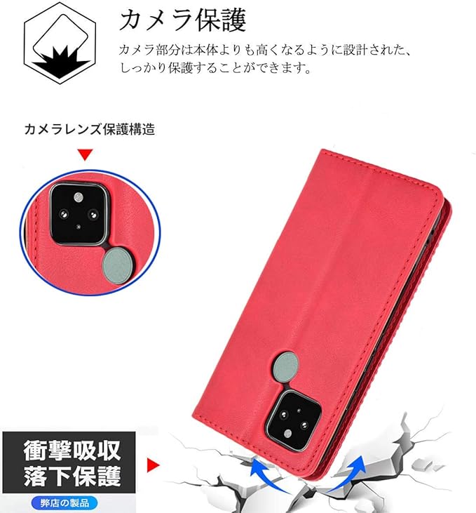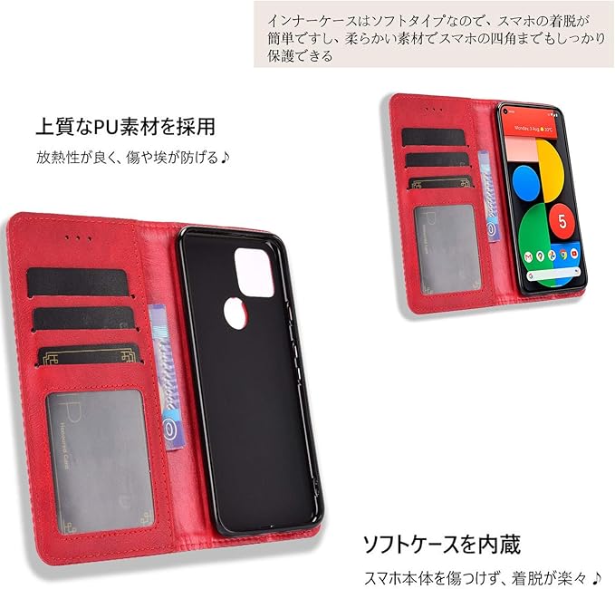 Google Pixel 5 ケース【MARR】 スマホケース 手帳型 シンプル カバー 手帳型ケース Google Pixel5 高級PU レザー カバー カードポケット 手作り スタンド機能付き 全面保護 マグネット 吸着 (レッド)