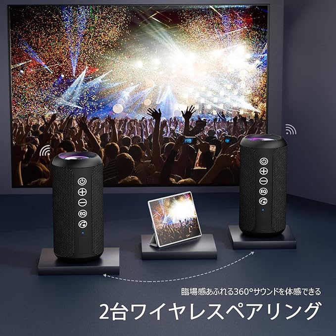 【Hi-Fiステレオサウンド&2台ペアリング機能】ブルートゥーススピーカーには2つの12W高性能オーディオ・ドライバーと進歩したデジタル信号プロセッサが搭載されており、どのボリュームでもクリアな高音、中音、特別に強化された低音が再生でき、最大の音量でも音は割れません。2つのスピーカーを同時に購入すると、2台ペアリング機能で2つのスピーカーをペアリングして、映画館のような360°ステレオサウンドを楽しんていただけます。