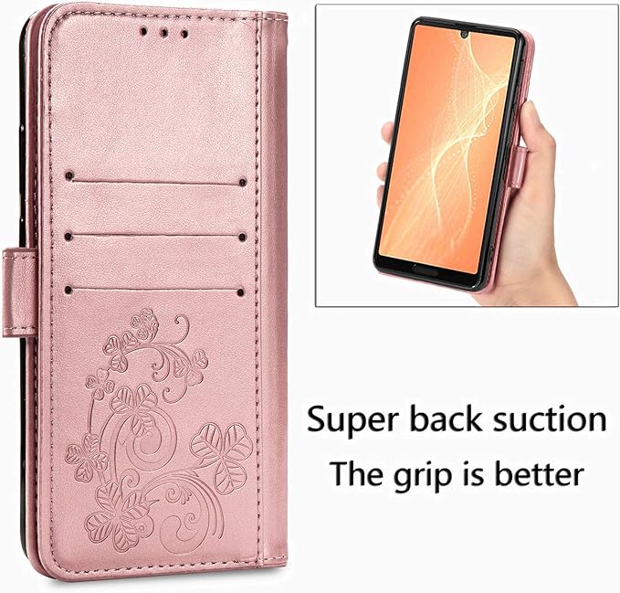 AQUOS sense4 ケース シン フィット アクオス SH-41A おしゃれ 純色 四つ葉のクローバーの印 PUレザー 上絵 手帳型 カード入れ Aquos Sense5G SH-53A au SHG03 財布カバー スタンド機能 耐衝撃 防塵 耐久性 装着やすい 吸着の機能 キラキラ 胡蝶 ラインストーン デコ メチャ可愛い アクオス センス 5g スマホカバー (Aquos Sense5G/Sense4, ローズゴールド)