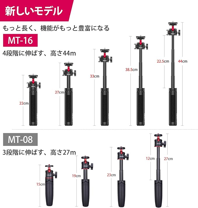 ULANZI MT-16 カメラ三脚 自撮り棒 スマホ3way 4段伸縮 卓上三脚 ミニ三脚 自由雲台 360度回転軽量 vlog セルカ棒 折りたたみ 持ち運び便利 Sony A6600/A6400/A6300/A6000/RX100 VII/A7 III/ZV-1/Fujifilm X-T100 X-T200 X-T4/Canon M6/G7X Mark III/iPhone/Android 適用