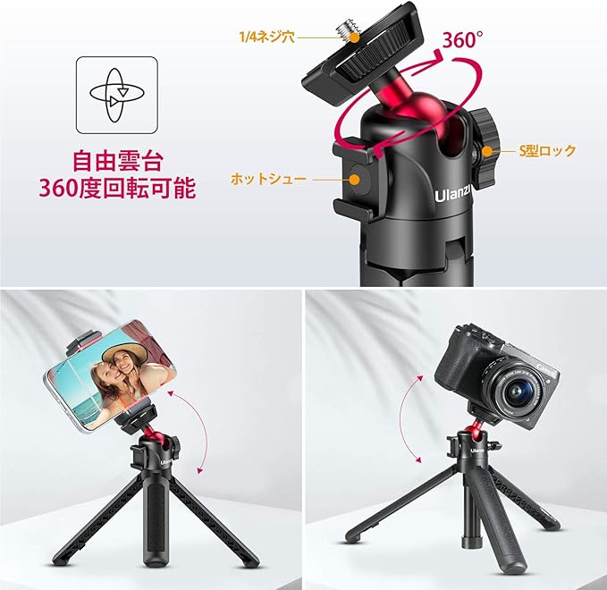 【三脚一脚兼用】Ulanzi卓上三脚はスマホスタンド・携帯スタンドとしては、しっかり地面やデスクの上に固定され、安定感が抜群です。室内の写真撮影や動画撮影、長時間露光撮影、ビデオ通話、生放送、Web会議などにも最適です。支柱が4段階で伸ばせ、自撮り棒としても使えます。DSLRカメラやスマホ/ GoPro用三脚アダプターと合わせて、旅行、休暇、屋外での使用に最適なアクセサリーです。
