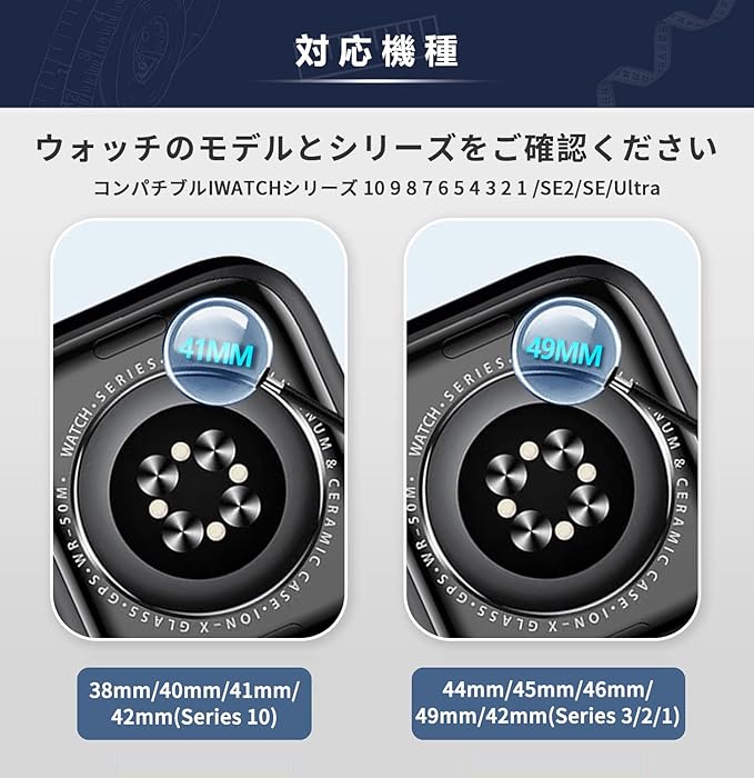 【対応機種】この時計バンドは38/40/41mmのApple Watchに適用します。例えば、Apple Watch シリーズ1/2/3 38mm、シリーズ4/5/6/SE 40mm、シリーズ7 41mmに対応。