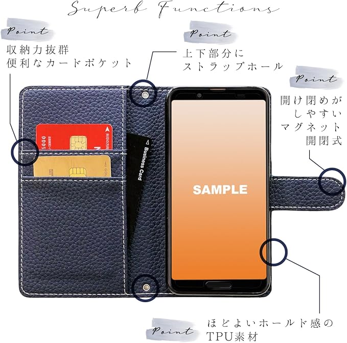 手帳部分と内側ケース部分は接着しておりますが、強くめくったりひっぱると剥がれる場合がございます。内側のケースは黒TPUを使用し、本体をカバーします。電源ボタンや音量ボタンなどは、黒TPUケースの上から押す仕様となっております。カメラ部分などは機種に合わせた開口部が開いております。
