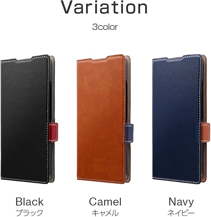 サイドベルトやインナーがバイカラーになった遊び心ある手帳型ケース/ピタッと固定できるマグネット仕様/すぐ取り出せて嵩張らないカード収納ポケット(1枚)/動画視聴に最適なスタンド機能/ストラップホール搭載