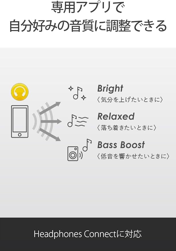 高音質かつ自分好みに調整可能 高音域から低音域までバランスが良好で、かつボーカルが自然で明瞭 DSEEで圧縮された音源をCD音質相当まで補完し、自分好みの音質に調整も可能