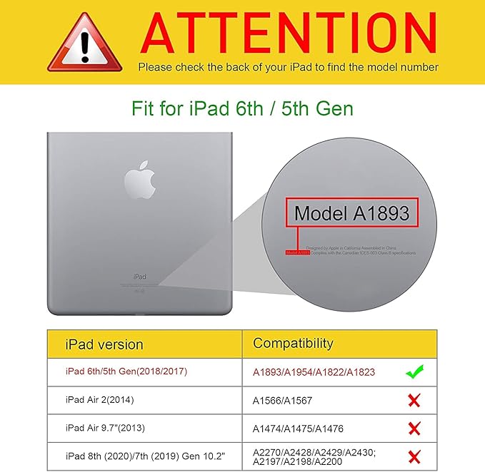 対応機種: Apple iPad 9.7 2018/2017 (モデル番号A1893、A1954、A1822、A1823)専用スマートケース カバー。 ご注意:2016年発売のiPad Pro 9.7(モデル番号A1673/A1674/A1675)が対応していませんので、ご注文の際に、お手元機種の背面にあるモデル番号を確認をお願い致します。