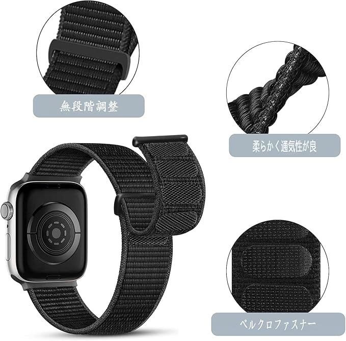コンパチブル Apple Watch バンド 40mm 41mm 42mm 44mm 45mm 46mm 49mm 柔らかく快適で軽量で通気性の良いナイロンスポーツループベルトアップルウォッチシリーズ 10 9 8 7 6 5 4 SE Ultraに対応 (40mm 41mm 42mm, ブラック)