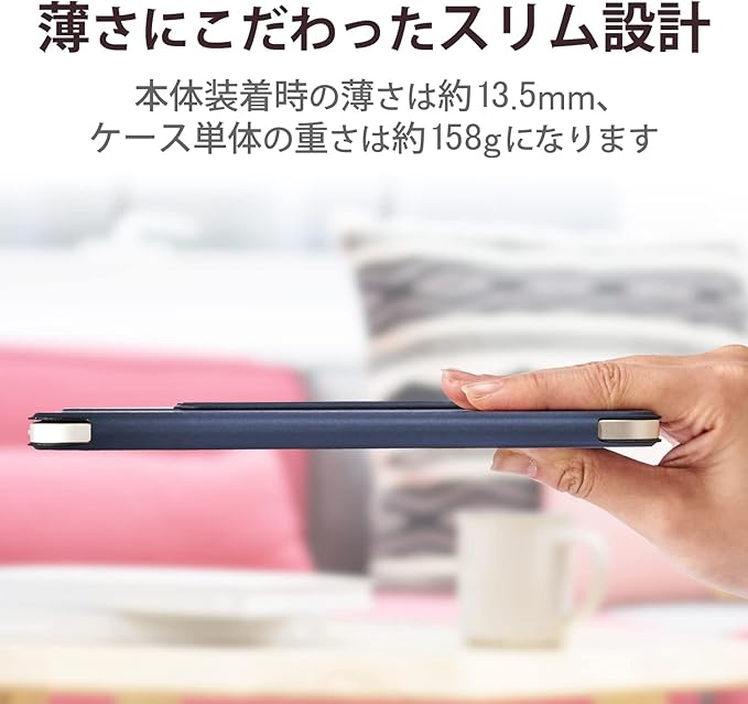 本体装着時の薄さは約13.5mm、ケース単体の重さは約158gです。本体のスリムなフォルムを損ねずにしっかり保護します。