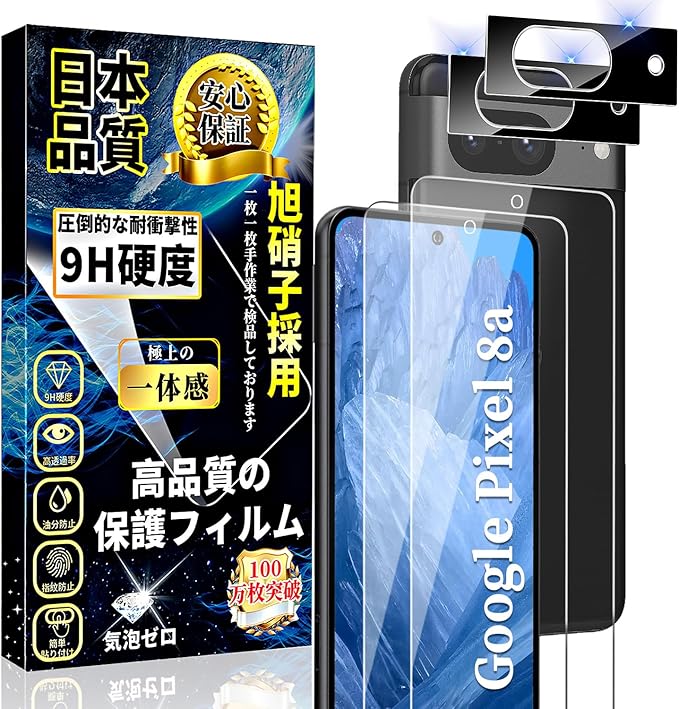 Google Pixel8a ガラスフィルム (2枚)+ Google Pixel8a カメラフィルム (2枚) Google Pixel 8a 液晶保護フィルム 指紋認証対応 旭硝子素材製 硬度9H 高透過率 飛散防止 気泡ゼロ 貼り付け簡単 ピクセル8a 保護フィルム+ピクセル8a レンズ保護 フィルム