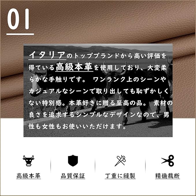 ?【高級牛本革】イタリアのトップブランドから高い評価を得ている高級牛本革を使用しており、大変柔らかな手触りで、見た目もすごく高級感があります。天然皮革(牛革)の特徴として、動物が生きた環境、食べ物、年齢などにより、皮の厚さ・硬さ・質感・シワ・傷・ホクロ・スジ・凹みなどが異なり同じものはふたつとありません。これが、さらに染色などの加工が施され更なる1枚1枚の味わいを醸し出します。経年変化(エイジング)は、自分だけの風合いがでることが革製品の醍醐