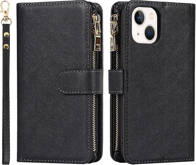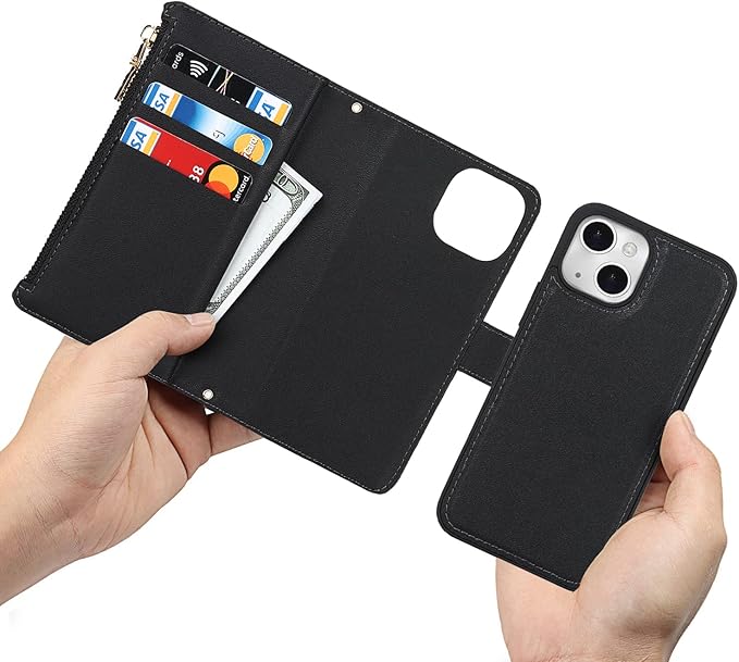 Pelanty 縄掛けケース for iPhone 13 ケース分離式 2in1手帳型 携帯カバー 手持ち縄掛け 合成皮革+TPU マグネット 取り外し自由 両用2way iPhone13 財布型カバー ICカード お札入れ小銭入れ大容量 収納ポケット スタンド機能 アイフォン13 ストラップ付き 落下防止 耐衝撃 全面保護(2in1分離式-ブラック)