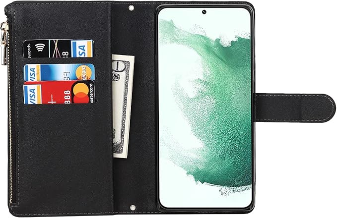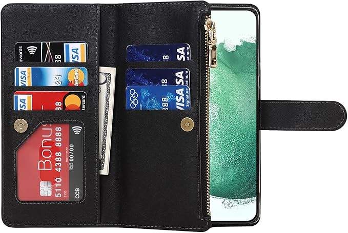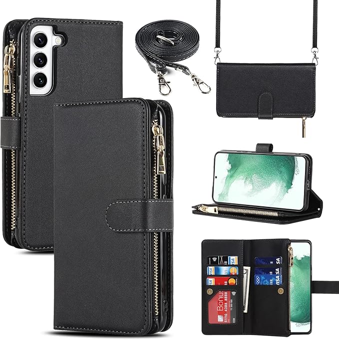 Pelanty for Galaxy S22 縄掛けケース手帳型 SC-51C SCG13 携帯カバー 肩掛け斜めがけ ショルダー 合成皮革+TPU マグネット Samsung S22 5G 財布型カバー ICカード お札入れ小銭入れ大容量 収納ポケット スタンド機能 サムスン ギャラクシー S22 ストラップ付き 落下防止 耐衝撃 全面保護(肩縄付き-ブラック)