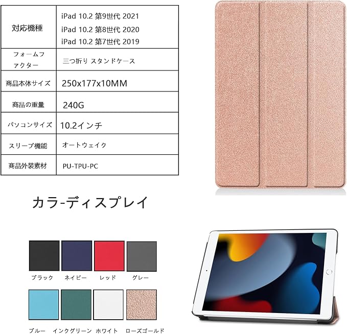 iPad ケース 10.2 第9/8/7世代 (2021/2020/2019年) オートスリープ/ウェイク対応 ipad 第9世代 ケース PUレザー製 薄型 超軽量 傷防止 三つ折スタンド ipad カバー PinLiSheng (バラゴールド)