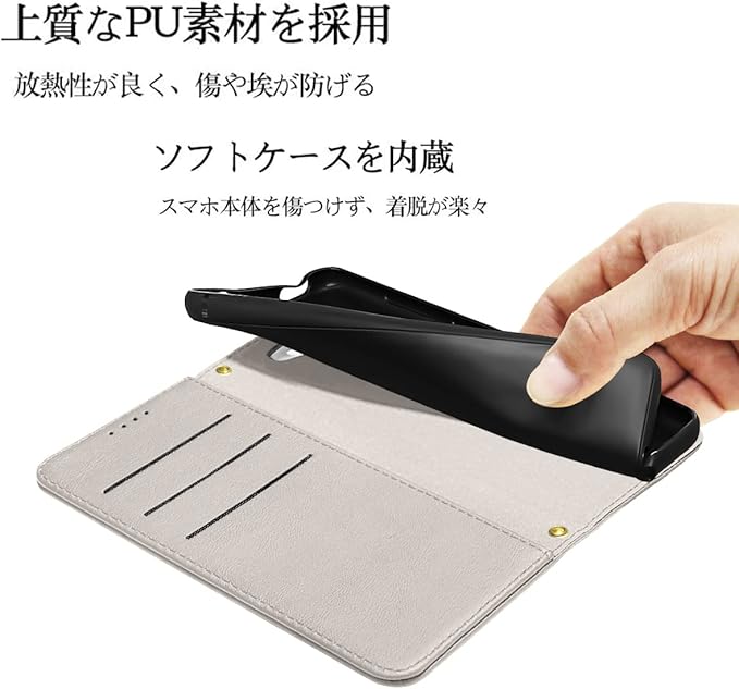 【素材】: (1)外:厳選されたレトロPU革で丁寧な縫製プロセスを施し、手触りが優しくて、落ち着いた色付けで汚れにくくて、使い勝手もとても。 (2)内:柔軟性が良いTPU材質のスマホホルダーです、着脱が容易,本体へ360°保護を提供することになります。放熱性が良、滑りにくく、指紋、油分などもつきにくく。ひとつひとつ職人の手で仕上げました。より良い素材と選ばれた職人が出会うことにより、最高級の革製品が完成します。