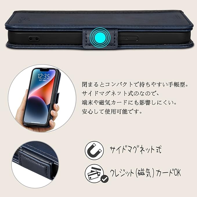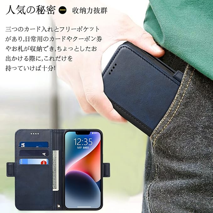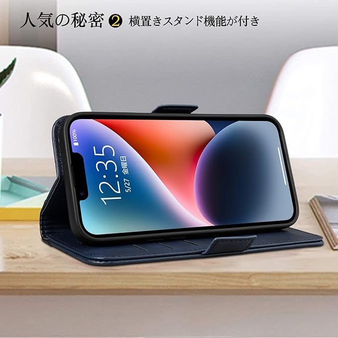横置きスタンドと収納力:横置きスタンド機能が付いて、好きな角度で動画鑑賞や読書などを楽しめます。アイフォン14のブック型ケースとして、内側には三つのカード入れとフリーポケットがつき、名刺や定期券の収納に優れているiPho