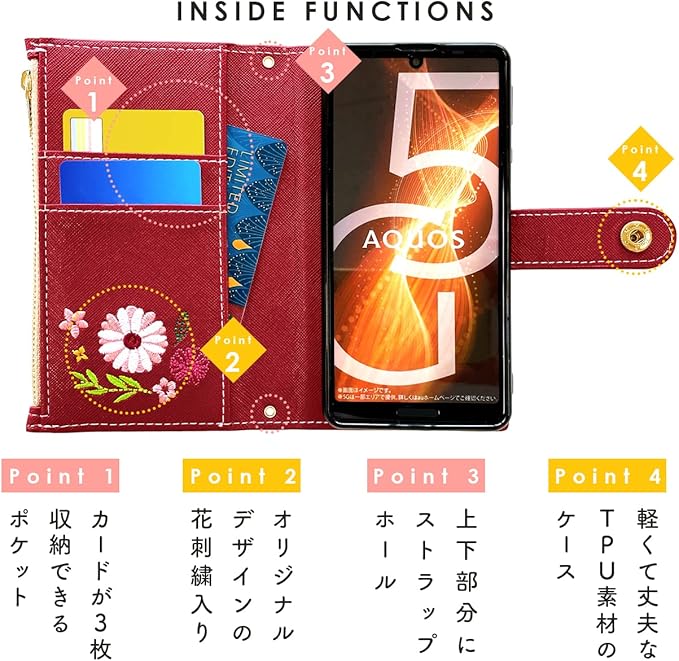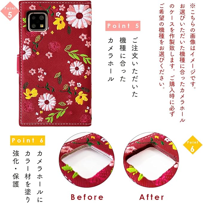 シンプルスマホ7 A404SH シンプルスマホ6 A201SH 用 ケース カバー 手帳型 手帳型ケース A201SHケース A201SHカバー シンプルスマホ6ケース シンプルスマホ6カバー シンプルスマホ 6 スマホケース スマホカバー おしゃれ花刺繍 レッド