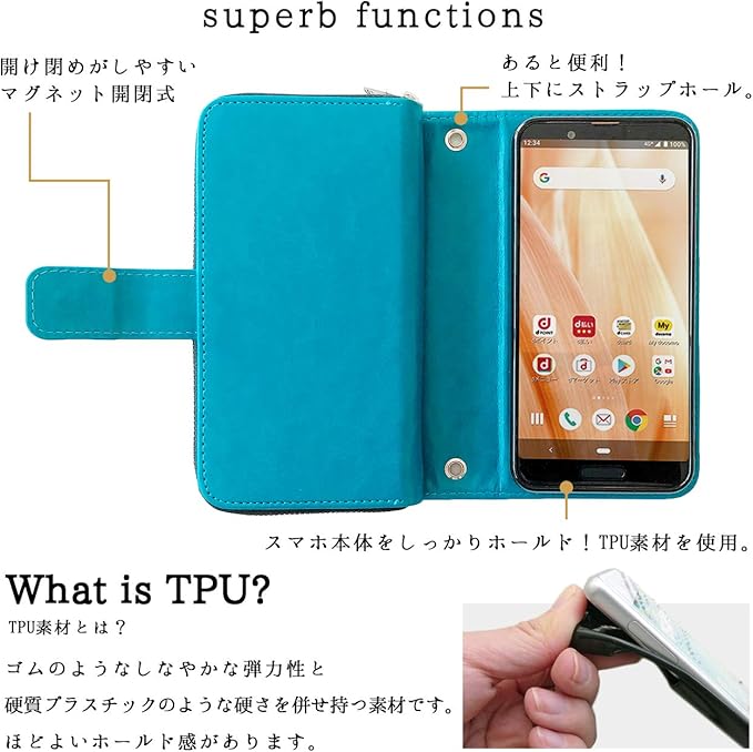ストラップ穴付き(中央上下部2箇所)のため、チェーンを付けたりストラップを付けることが可能となります。手帳の素材は合皮PUレザーとなります。電源ボタン・音量ボタン等はケースの上から押す仕様となります。予めご了承ください。